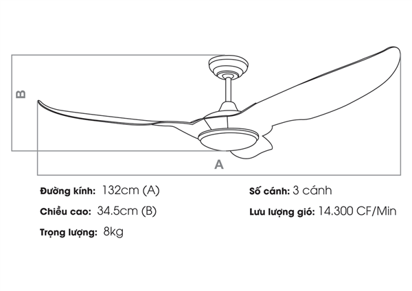 Quạt có đường kính 1320mm thích hợp cho phòng có diện tích từ 14-21m2, với 3 cánh quạt được làm từ Nhựa ABS cao cấp giúp cánh bền đẹp không bị cong vênh theo thời gian.